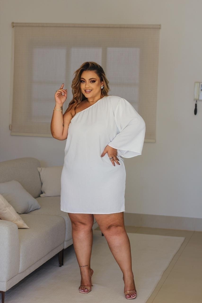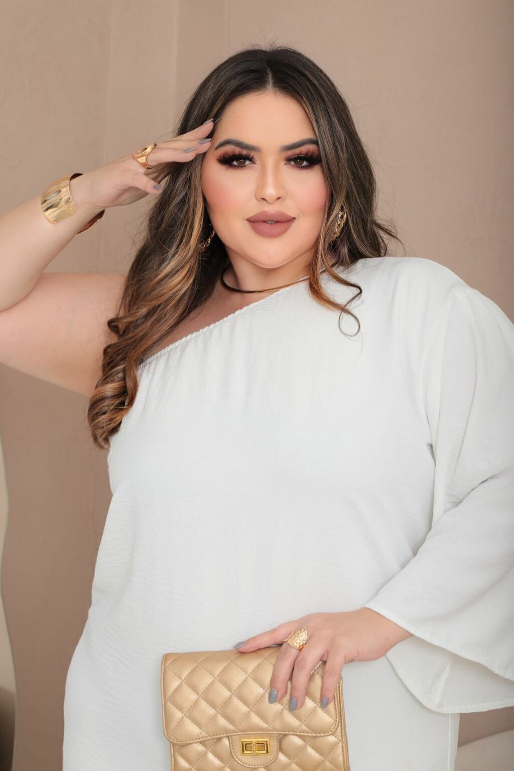 Encante-se com nosso vestido branco para noiva no civil curto, um ombro só, ideal para noivas que buscam elegância e sofisticação no grande dia. Confeccionado para oferecer conforto e estilo, este modelo plus size é projetado para realçar suas curvas de maneira deslumbrante.