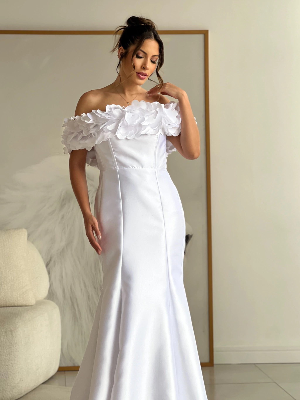 Desperte o encanto no seu grande dia com este vestido de noiva deslumbrante. Feito em cetim, o vestido possui um caimento perfeito que destaca a silhueta, enquanto as delicadas aplicações de flores acrescentam um toque romântico e sofisticado.