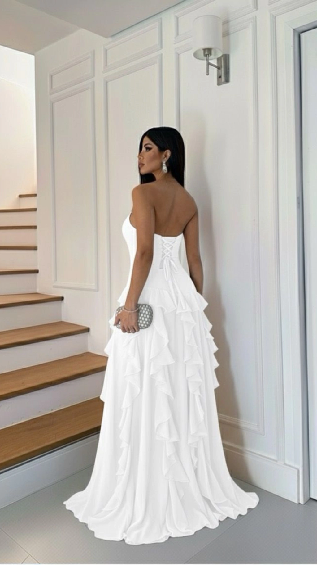 Vestido Longo Branco Tomara Que Caia, Acinturado Com Babados ( Yasmin)