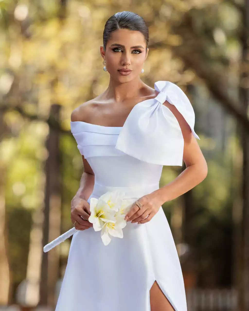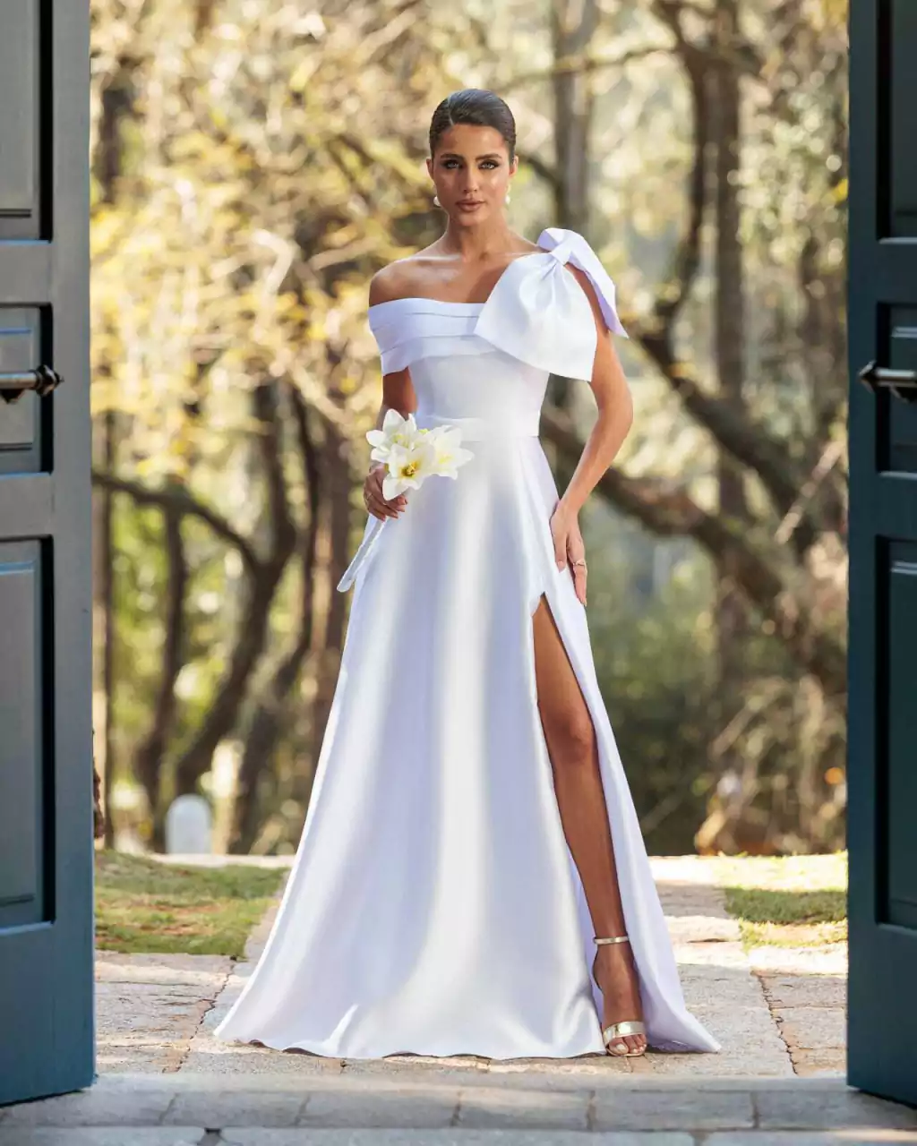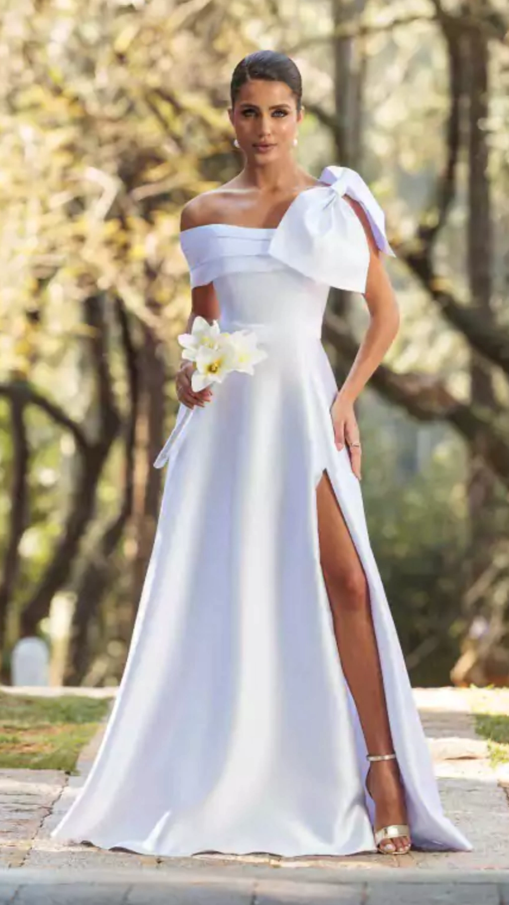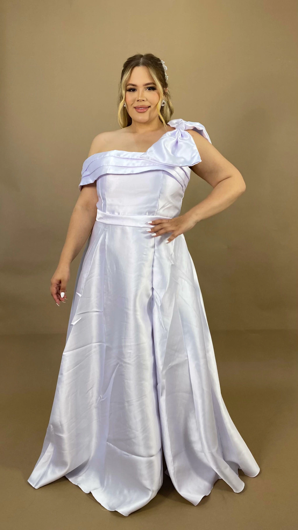O Vestido Longo de Cetim Um Ombro com Laço é a escolha perfeita para a noiva que deseja irradiar elegância e sofisticação. Este vestido, confeccionado em cetim de alta qualidade, proporciona um caimento impecável, destacando-se pelo seu design sofisticado de um ombro só e o charmoso laço, que adiciona um toque de romantismo e delicadeza.
